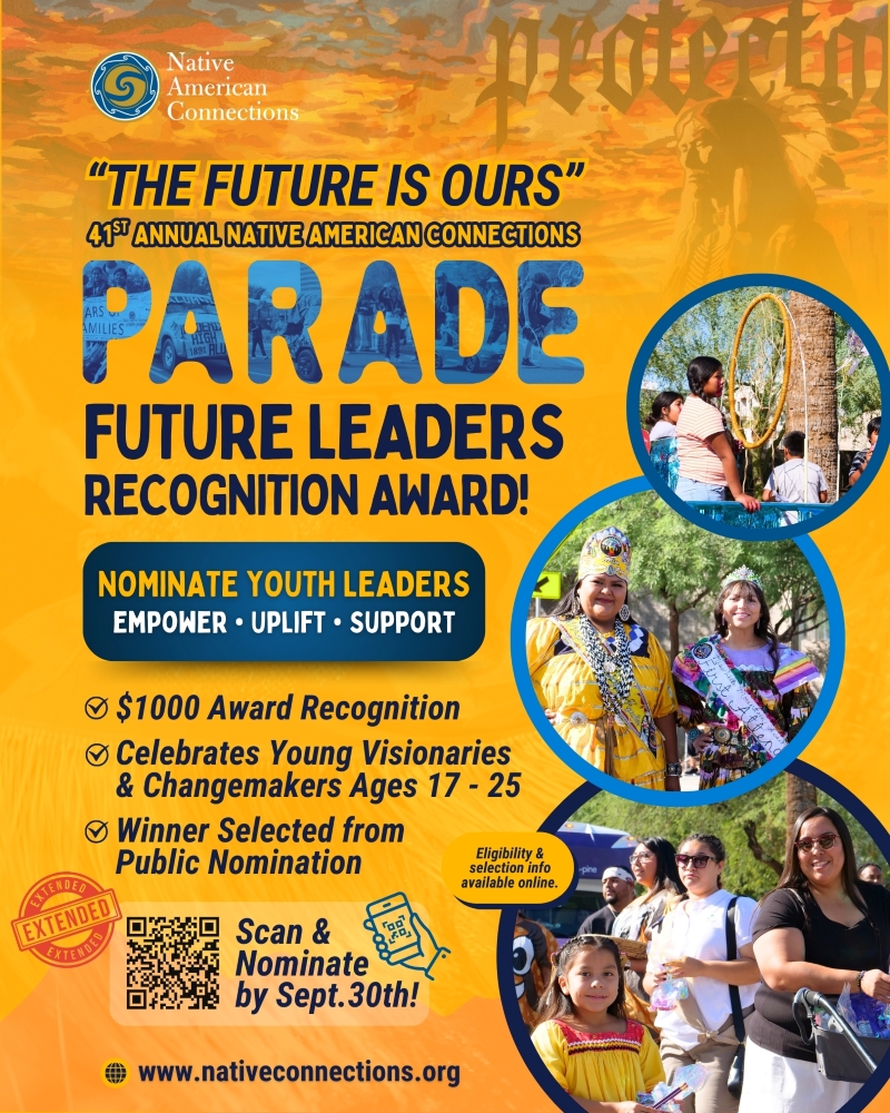 Do you know a Native or Indigenous youth who's showing up, leading with heart, and shaping the future? We’re celebrating one outstanding young leader (ages 17–25) at this year’s NAC Parade on October 11, 2025 and we need YOUR help to find them. Submit a nomination for the Future Leaders Recognition Award presented by Native American Connections!